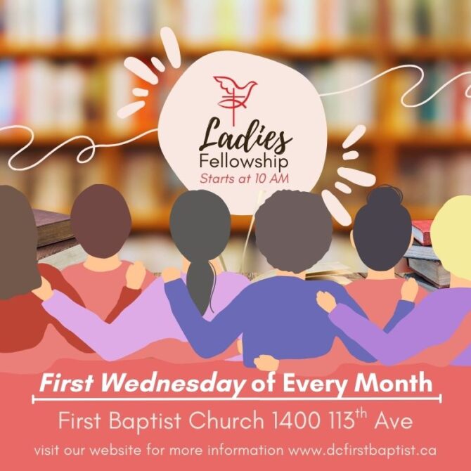 Join the ladies of Dawson Creek on the first Wednesday of every month at 10:00 AM for coffee, tea, and fellowship at First Baptist Church Dawson Creek. All women are welcome!